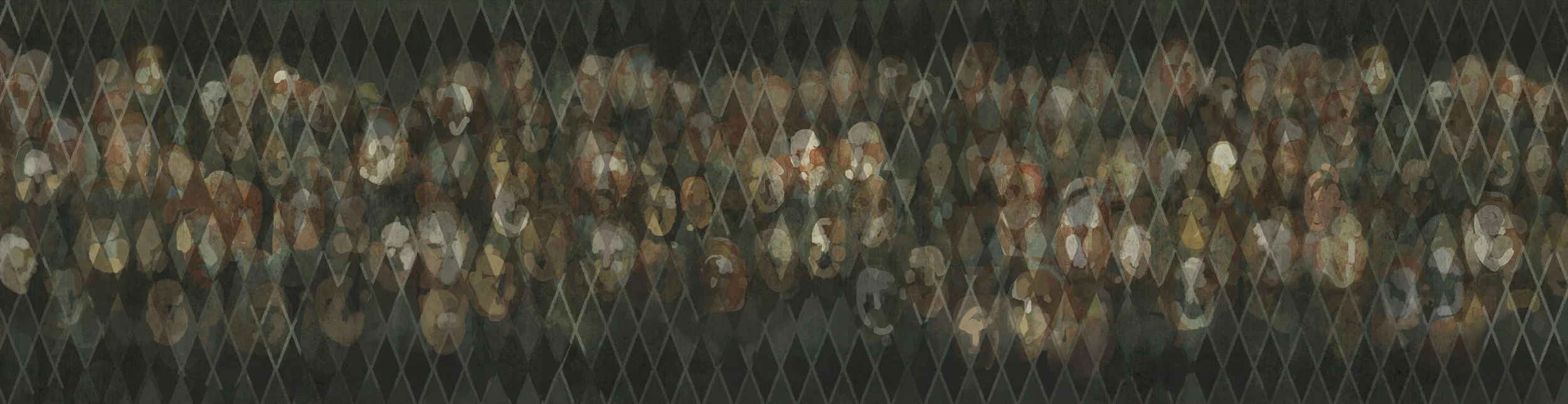 This artwork was created to be split into panels that the engulf interior of the auditorium. the designer’s brief was to create artwork that makes the audience feel like they are beiNg watched.